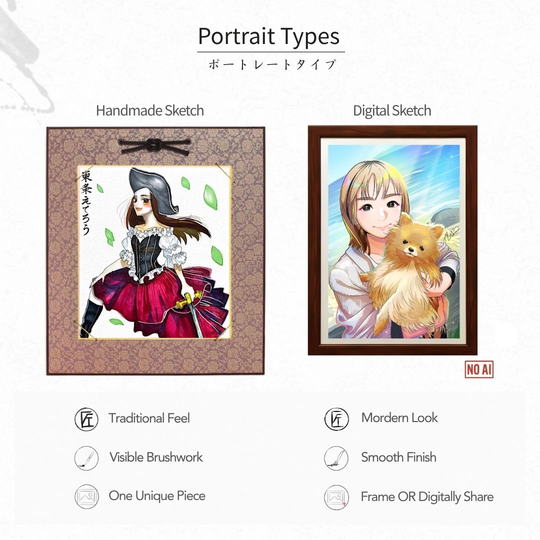 Both Handmade and Digital sketch are 100% handcrafted using traditional tools and techniques and shipped to your doorstep. Handmade is drawn using physical paint or markers while digital sketch is drawn digitally.